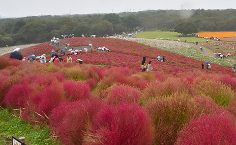色づいたコキア(阿曽 富雄) 当日は時々霧雨が降っていましたが、独特の赤色をしたコキアが丘の斜面一面を染めていました。晴天であればコキアの赤色がもっと映えたと思うと残念です。なお、レンズに少し水滴がつきました。(使用カメラ :Nikon D750)